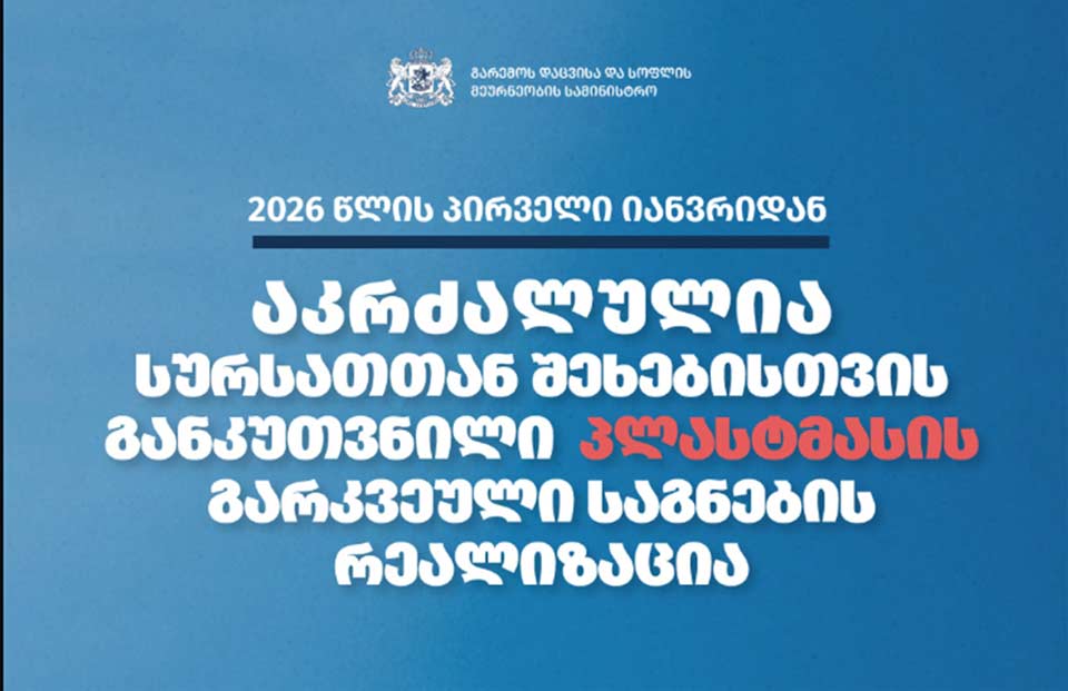 საქართველოს გარემოს დაცვისა და სოფლის მეურნეობის სამინისტრო სურსათთან შეხებისთვის განკუთვნილი პლასტმასის გარკვეული საგნების მოხმარების აკრძალვასთან დაკავშირებით, რომელიც პირველი იანვრიდან შედის ძალაში, ინფორმაციას ავრცელებს.