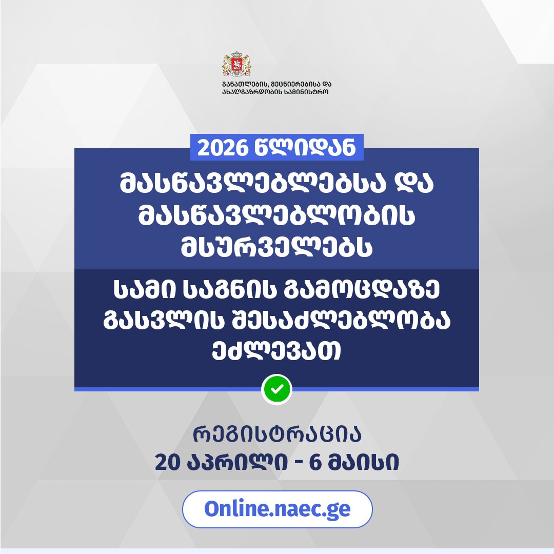 საქართველოს განათლების, მეცნიერებისა და ახალგაზრდობის სამინისტროს გადაწყვეტილებით, პირველად, 2026 წლიდან მასწავლებლებსა და მასწავლებლობის მსურველებს უფლება აქვთ, ნაცვლად ერთი საგნის გამოცდისა, ერთდროულად დარეგისტრირდნენ და ჩააბარონ არაუმეტეს სამი საგნის გამოცდა და აგრეთვე, უფროსი სპეციალური მასწავლებლისა და საბაზო პროფესიული უნარების გამოცდები.