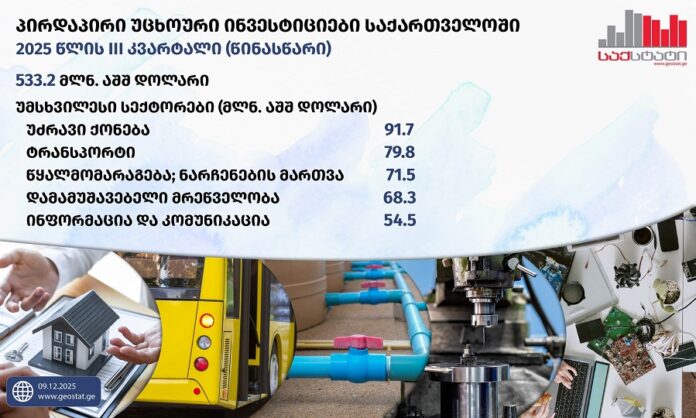 სტატისტიკის ეროვნული სამსახურის წინასწარი მონაცემებით, საქართველოში განხორციელებული პირდაპირი უცხოური ინვესტიციების მოცულობამ 2025 წლის მესამე კვარტალში 533.2 მლნ აშშ დოლარი შეადგინა, რაც 2024 წლის მესამე კვარტლის დაზუსტებულ მონაცემებზე 2-ჯერ მეტია.