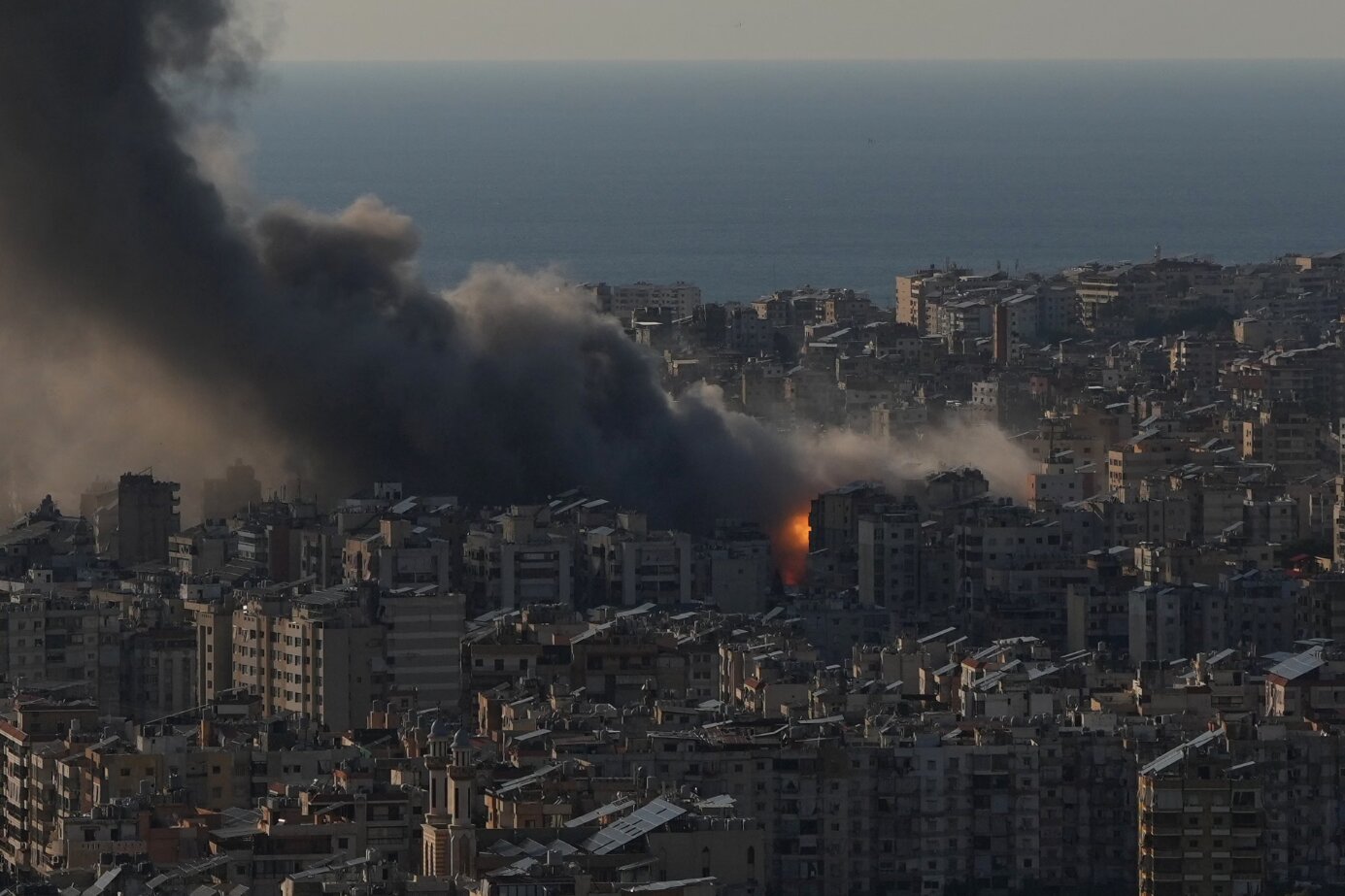 ლიბანის ბეირუთის სამხრეთ გარეუბან დაჰიეჰზე ისრაელის საჰაერო დარტყმების შემდეგ ცეცხლი და კვამლი ამოდის. ფოტო: ჰასან ამარი/AP